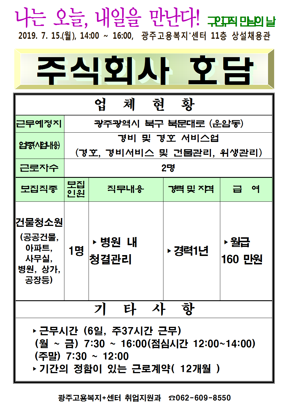 | 구인·구직 만남의 날 [2019.6.25.(화), 오후 2시, 광주고용복지+센터 11층 상설채용관] (0) | 2019.06.24 |